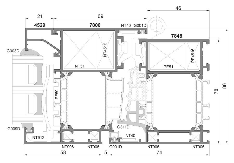 Предназначен для использования в оконных конструкциях с очень высокими требованиями к теплоизоляции. Глубина установки рамных профилей 78 мм, створок 86 мм. Использование многокамерного теплоизолятора толщиной 42 мм и двухкомпонентной центральной уплотнительной резины позволяет добиться высокого уровня теплоизоляции. Система позволяет использовать широкий спектр фурнитуры, а также облегчает ее монтаж. Трехкамерная структура системы PE 78N обеспечивает им высокую стойкость, что позволяет изготавливать крупногабаритные конструкции.